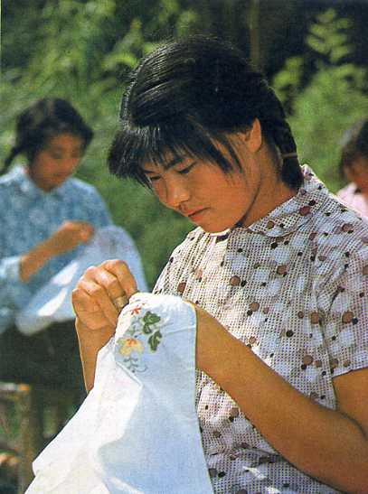 装饰台布、餐巾的淮绣是淮安农村妇女的家庭手工艺。