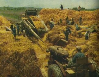 南京农学院师生,带着农业机械设备,到江浦县支援兰花公社的夏收夏种工作。这是学生们在帮助社员脱粒。(1960年)