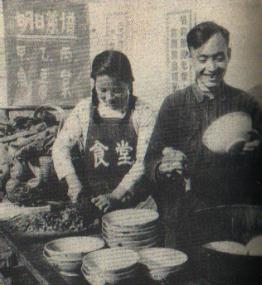 金溪县浒湾公社丁家大队的十个食堂,在大队党支部的领导和重视下,由于始终坚持了“以人定量、指标到户、粮食到堂、凭票吃饭、节约归己”的原则,普遍做到了计划用粮、忙闲调剂、有干有稀。图为大队党支书王炳发(右)下到食堂当炊事员。(1960年)