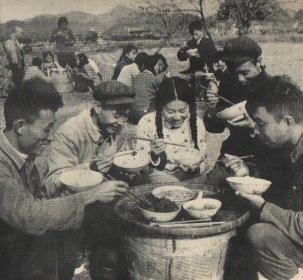 在农忙的季节里,食堂常把饭菜送到田间来。(1960年)