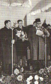 中国—印都尼西亚民航线于1965年1月6日正式通航。广州各界人民在广州国际机场隆重举行开航仪式。图为邝任农(左)在开航仪式上。