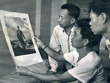 安源煤矿革委会主任贾志朴(中),老工人苏元冬(右)、贾德平(左)怀着对伟大领袖毛主席无限热爱的激情,赞扬这幅革命油画。