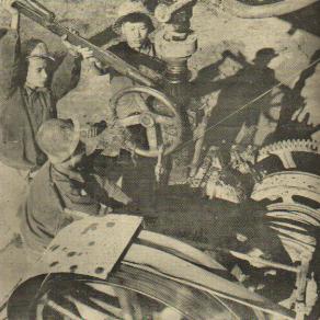 宜春专区地质大队“302”分队,成立只有一年多,但由于他们革命干劲足,因而面貌日益改观,生产高速跃进,红旗举得很高。图为共产党员程水妹领导的青年标兵班采用快速大压钻进,时效突破了50米。(1960年)