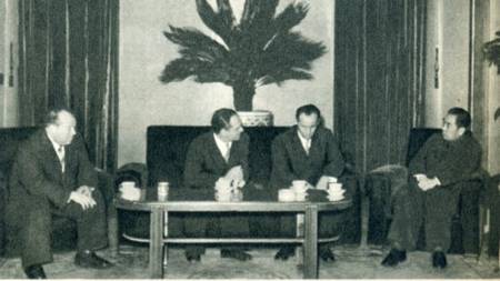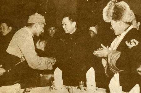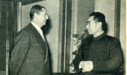 周恩来总理在1955年7月25日举行了盛大酒会,招待前来访问的各国和平代表。图为周总理和大山郁夫握手。左一是日本和平代表团团长高桑纯夫。