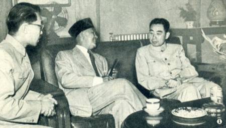 1955年8月16日,周恩来出席印尼驻华大使馆庆祝印尼国庆10周年宴会。图为出席宴会的周恩来和莫诺努图(中)大使。