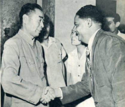 周恩来总理7月7日接见了埃及学生代表团全体人员。和周总理握手的是团长哈山·阿斯玛维。