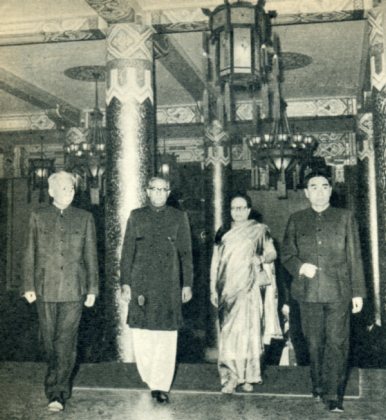 巴基斯坦驻华大使阿哈默德3月23日举行盛大招待会,庆祝巴基斯坦伊斯兰共和国成立。刘少奇委员长和周恩来总理出席了招待会。刘少奇和周恩来在阿哈默德大使和夫人的陪同下进入会场。