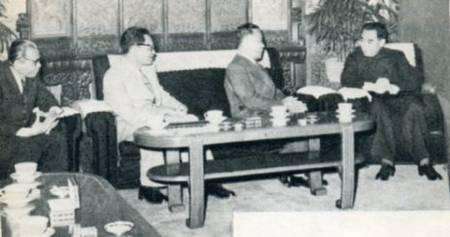 周恩来总理在8月29日接见了歌舞团团长奥?斯科夫兰(中)和南斯拉夫联邦共和国驻我国大使波波维奇(右)。