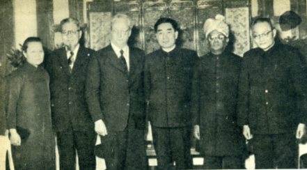 周恩来总理1956年3月22日接见了瑞典行道会牧师聂思仁和印度信义会监督孟尼根。左起:吴贻芳、陈崇桂、聂思仁、周恩来、孟尼根、吴耀宗。