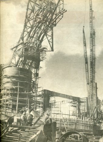 鞍钢的一座正在改建中的自动化高炉。它是由重工业部黑色冶金设计院负责技术和施工的。设计院的代表季景熙(中)和工地主任季德文(右)在视察施工情况。