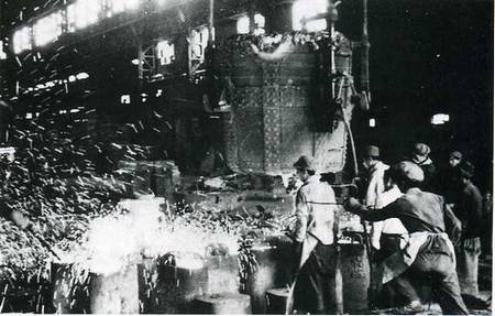 图为鞍山钢铁厂工人为完成国民经济恢复的任务而紧张工作。
