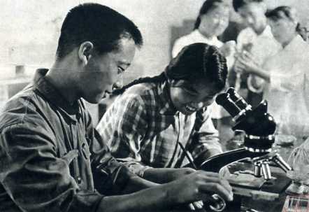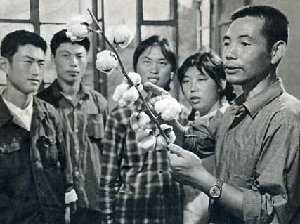 朝农党委努力建立一支以贫下中农为主体的教师队伍。杨景龙(左)从朝农毕业后,被聘为兼职教师。这是他和小麦课题组的师生一起进行科学研究。