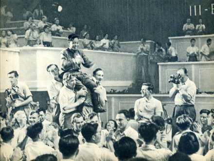 高玉宝在1953年7月举行的第三届世界青年代表大会上,当朝鲜停战协定签字的消息传到了会场时,他被欢呼的代表们高抬起来。