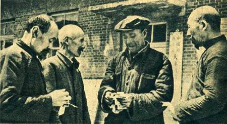 铁路工厂的老年工友得到了养老金,他们在愉快地谈笑。