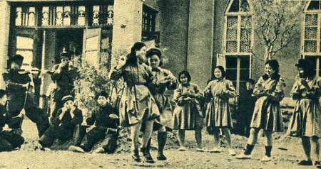 金州纺织厂的工友在漂亮的宿舍门前奏乐舞蹈,歌颂生活的幸福。