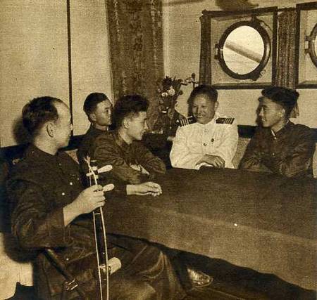 当航行结束时,在甲板上经常举行各种表演会,海员们生活在团结、友爱的气氛中。