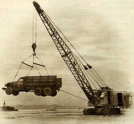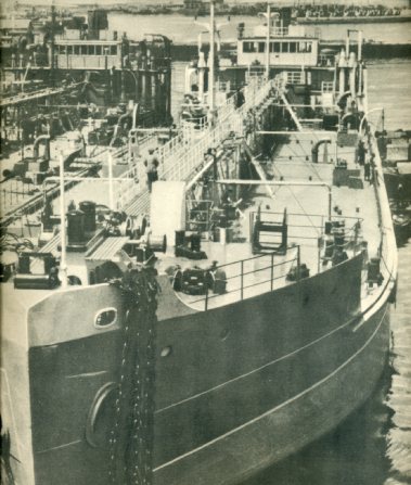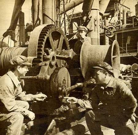 海中起重机正将180平方尺重达8吨的钢板装上货轮。这种起重机每次可以装卸25吨。