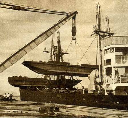 为了发展城乡物资交流,内河航运需要大量的小轮。图为起重机正将小货轮装到万吨大货轮上去。