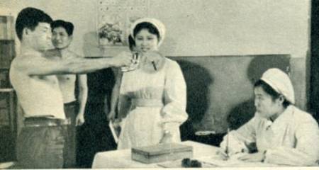 史白玉装车小组从前是最落后的组,每人每天只装6、7车。自展开爱国主义生产竞赛后,他们的觉悟提高了,现在平均每人每天装16车(最前者为史白玉)。
