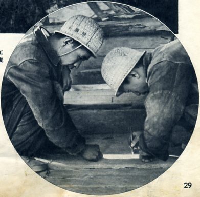 抚顺市劳动模范金海(右)是20年前开始到这个厂为做工的。去年制造大牙轮时,他和伙伴们共同创造了一种代用工具,为国家节省了1万元,而且提前63小完成了生产任务。