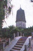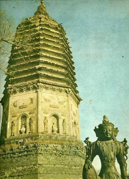 辽阳白塔建筑于金代(公元1115—1234年),高71公尺21公分,甎筑实心,有8角13层。塔前的铜佛像,原在广佑寺内,该寺清末已颓废不存,佛像移此地。(1953年)