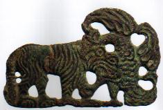 鹰虎搏斗纹铜饰牌。西丰县西岔沟幕地出土。匈奴文化,高6.5厘米,宽12厘米。