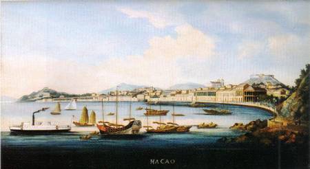 该画显然是从 Lappa 岛向澳门方向绘制的。该岛现已建桥与大陆相接。从画上可以看到左远方的主教山(Penha Hill)。中间两座大建筑物,一座是Palacio,另一座属东印度公司。最右侧是总督府,总督府前面是座小炮台(St.Peter Fort),中间靠右的山上是大炮台(Fort Monte)。最右侧山上是一炮台(Fort Guia),炮台下面是一修道院(Monastery of San Francisco)。该画1993年克利斯汀拍卖价为450,000-450,000港元。