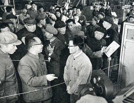 谷牧副团长参观银川长城机床厂时和工人亲切交谈。