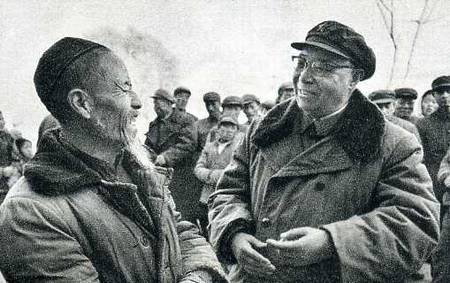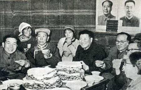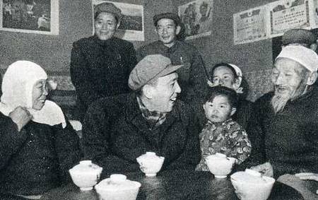 中央代表团副团长、中国人民解放军兰州部队副司令员刘静洚(右)到固原县农村看望社员。