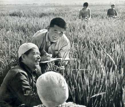 吴忠县古城大队员回族老社员丁学礼,是科学种田的积极分子,这是他和青年社员一起观察水稻新品种生长情况。