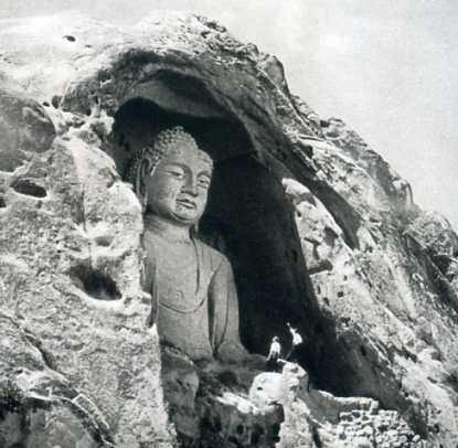 固原须弥山石窟的露身佛像,高二十公尺,是公元七世唐代的古迹。