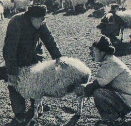 宁夏回族自治区滩羊主要产地之一的盐池县滩羊选育场,为了进一步提高滩羊质量,争取羊只丰收,领导干部、技术人员和牧工,在接羔季节到来之前,就对保胎、接羔和育羔工作进行了详细的研究和安排。因此,羊羔成活率较高,而且生长良好。图为牧工们在摸胎,检查下羔前情况。(1962年)