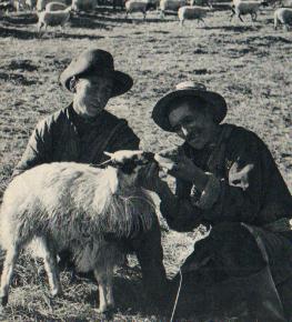 藏族老牧民、共产党员马洛(右),是祁连县阿力克乡草大板公社的放牧员。他每年负责放牧的三百多只母羊,每年产羔近四百只。从1958年到去年春天,共育成羊羔二千六百三十多只,创造了藏系母羊年繁殖成活率的高产记录。马洛从七岁起就跟父亲给牧主“千户”放羊,在旧社会,度过了三十三年的奴隶生活。解放后,在生产斗争的实践中,马洛不仅摸索出一整套科学放牧办法,而且积累了羊只病害防治的经验。遇到羊只有病,自己就动手治疗。(《民族画报》1966年第2期)