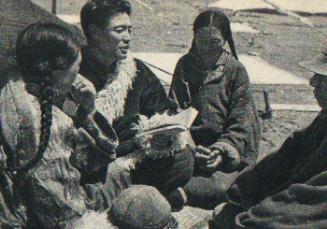 过去连人身自由也没有的“塔洼人”甲羊(左二),现在是祁连县阿力克乡的乡长。这是他和牧民在一起。(1963年)
