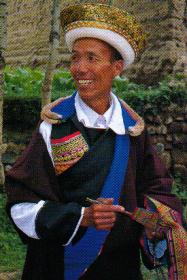 土族男子服饰。土族男子传统服饰为内穿绣花高领白色短褂,外套黑色或紫色斜襟无袖长袍,腰间系精美绣花腰带,带端垂吊在前,俗称“前搭子”。脚穿白布袜、蒙式皮靴,头戴圆顶翘檐毡帽。