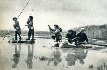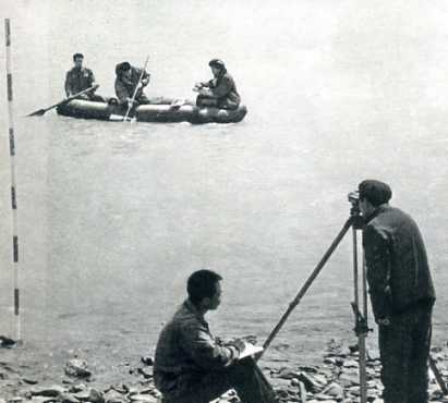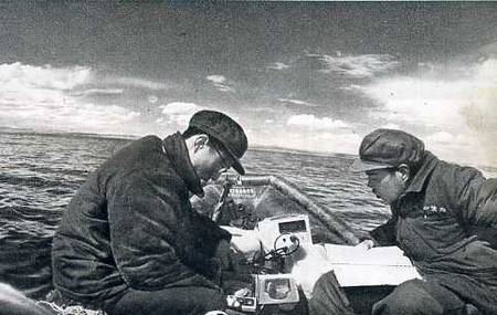 水文地质队乘着羊皮筏在尕斯库勒湖上测量湖深和水温。