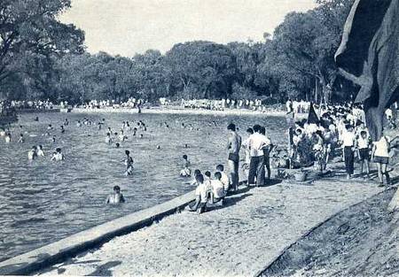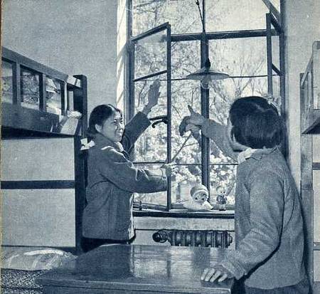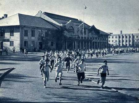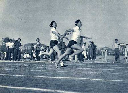 在1959年首都高等院校田径运动会上,我校获得男女总分第一。这是我校运动员在女子4x100米接力赛途中。