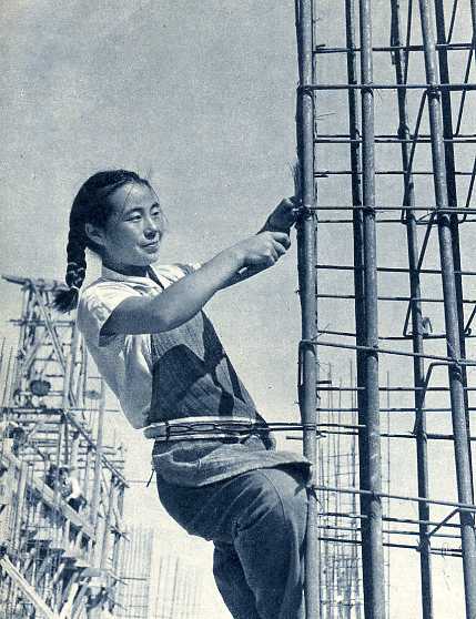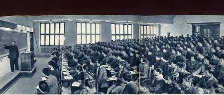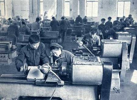 清华大学附设综合机械厂机装车间一角。学生正在这个用学校自制机床装备起来的车间里进行生产劳动。
