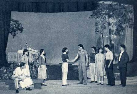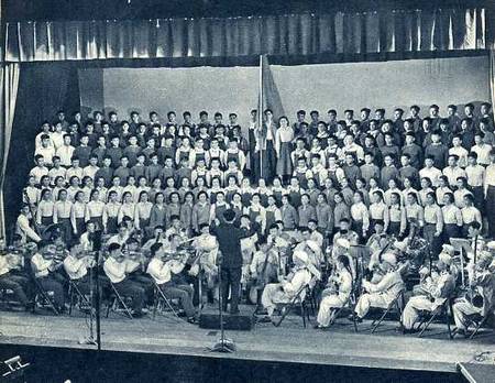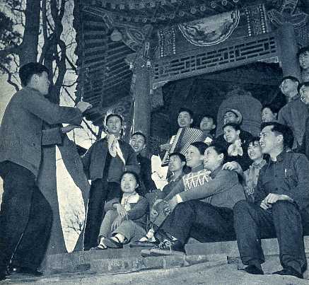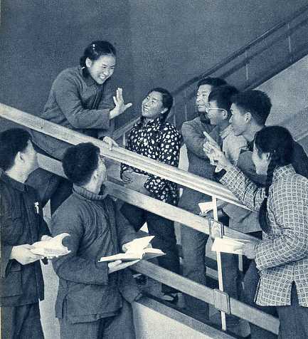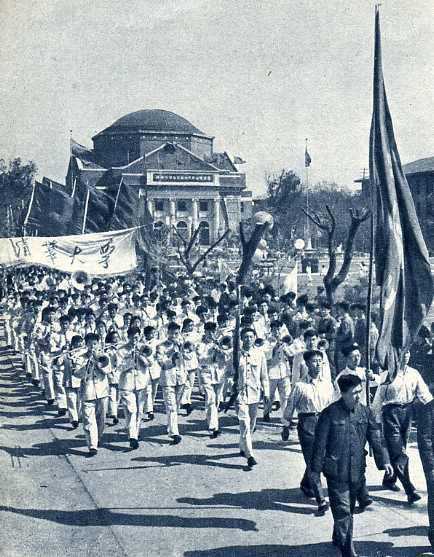 我校学生文工团访问上海。这是演出自编的大合唱“党的教育方针就是好!”