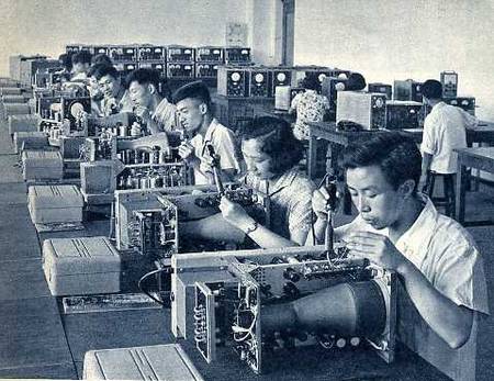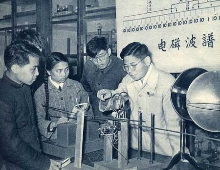 无线电电子学系学生结合教学实习自制实验仪器脉冲示波器。