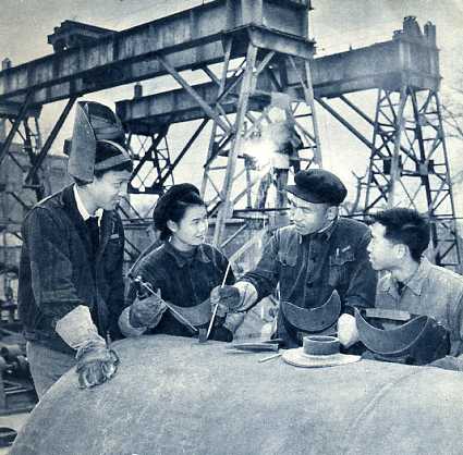 我校冶金系八级技工、全国文教群英会特邀代表李廷贵在向学生传授焊接技术。
