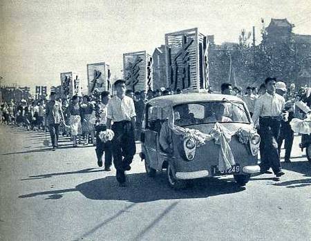我校师生驾驶自己设计的微型汽车参加国庆十周年游行。