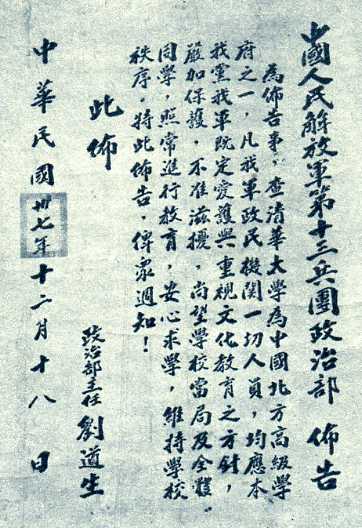 1948年月12月清华园获得解放。这是中国人民解放军关于保护清华大学的布告。