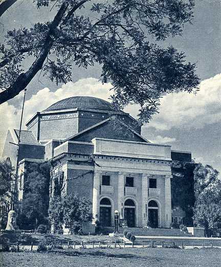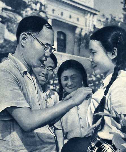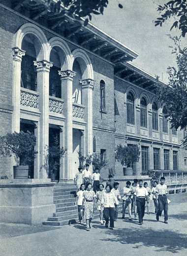 我校学生于1959年在中国人民政治协商会议礼堂举行汇报演出。这是周恩来总理在演出后接见我校学生演员。