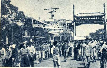 1947年“五?二0”运动中,清华学生高呼反饥饿反内战的口号参加示威游行。