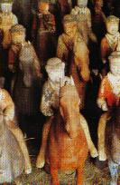 阳陵陶俑出土情况—1990年开始,在陵园南区发现了大型丛葬坑,出土了许多约真人体高三分之一的裸体陶俑,还有其他文物。这是其中一处丛葬坑中陶俑出土时的情况。
