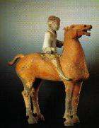 彩绘骑马带犬俑—(唐)高30.5厘米、32.5厘米;1960年永泰公主墓出土。