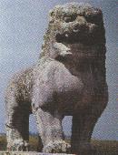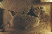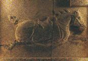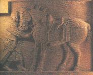 飒露紫—是唐武德四年(621年)李世民于洛阳会战王世充时的坐骑。刻有将军丘行恭为骏马拔箭的场面。现藏美国宾夕法尼亚大学。