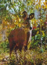 镇坪县养麝实验场已能成群地驯化和繁殖麝。图为工人在喂养麝群。(1973年)