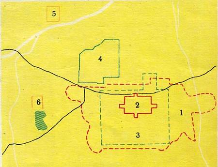西安历代城区面积略图:1、现在的西安市区。2、西安旧城。3、唐代长安城。4、汉代长安城。5、秦代咸阳城。6、西周镐京。